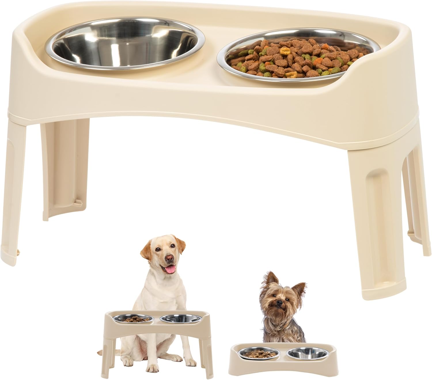 IRIS USA Elevated Dog Bowls, Adjustable Height, 2 Thick 64 oz Stainless Steel Bowls, Spill-Proof with Raised Outer Rim, Durable Made in USA Plastic, Easy Assemble, 2 Heights 4.63" or 12.25" Almond
