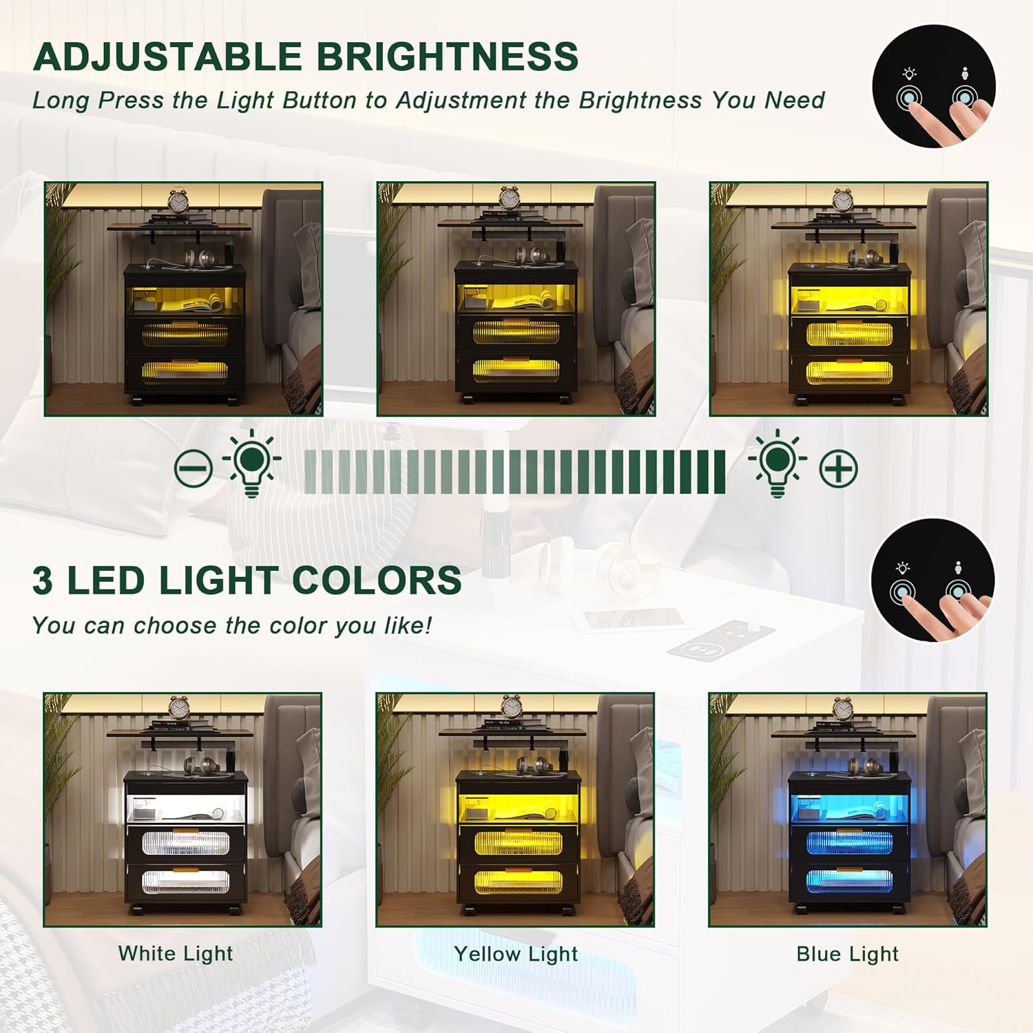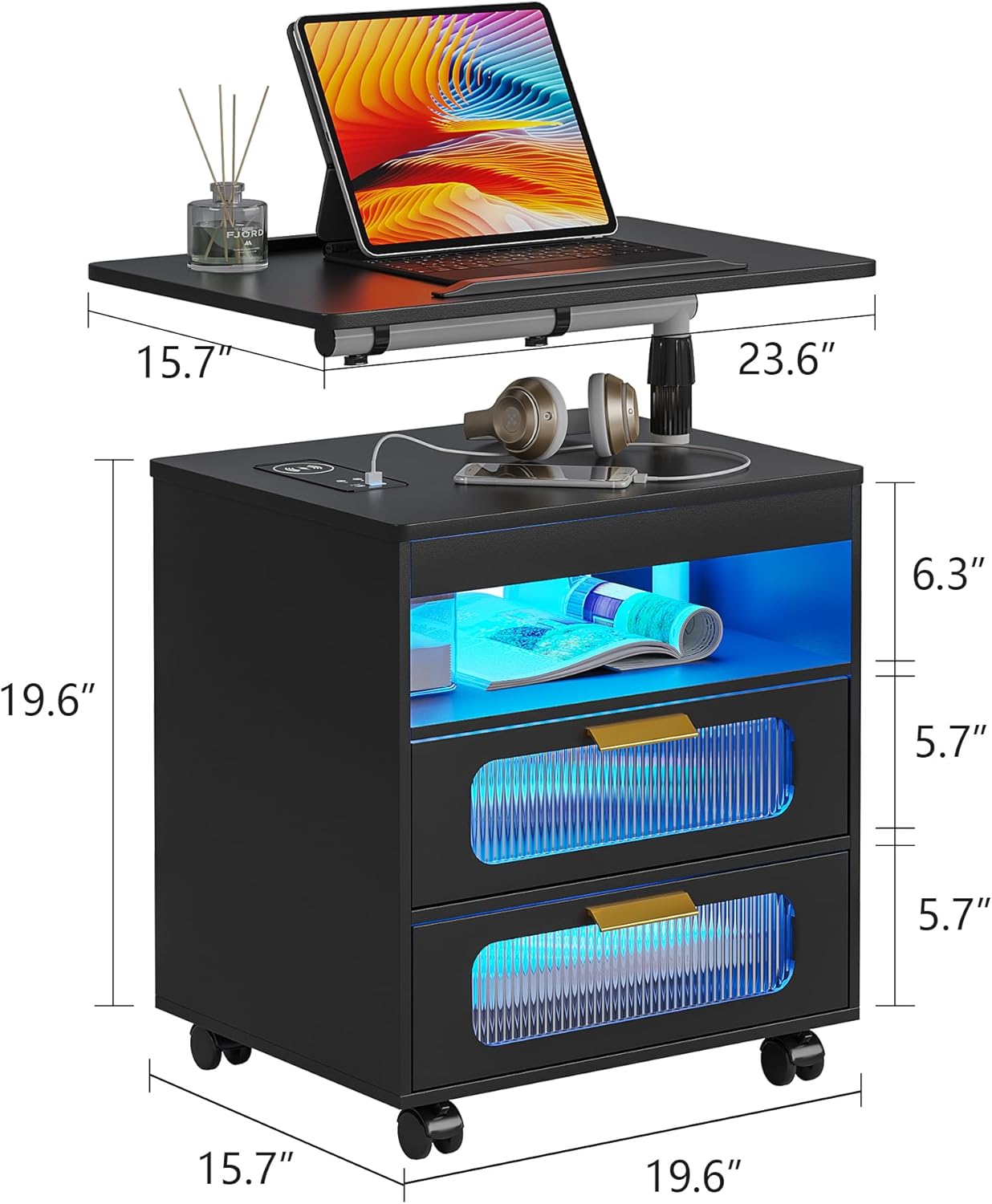- â ăLarge Capacity Spaceă The led nightstand provides spacious storage for nighttime essentials. There is a swivel desk; Open storage shelves; 2 drawers,The desktop can hold everyday items and keep them within reach.