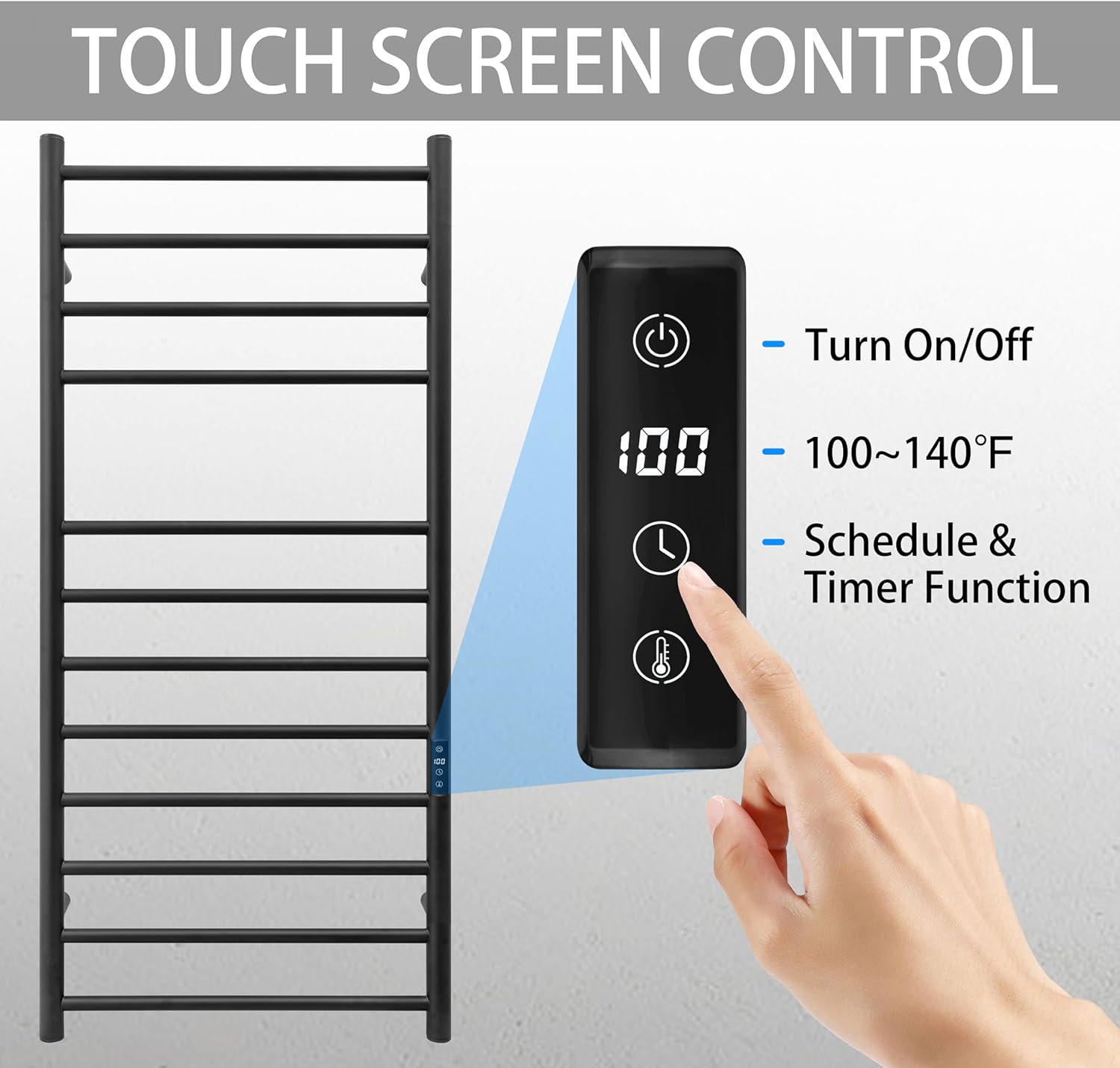 - [TOUGH SCREEN CONTROL]: Manually to turn on/off anytime. Countdown Timer function from 1 hour to 8 hours. Temperature control from 100°F to 140°F.