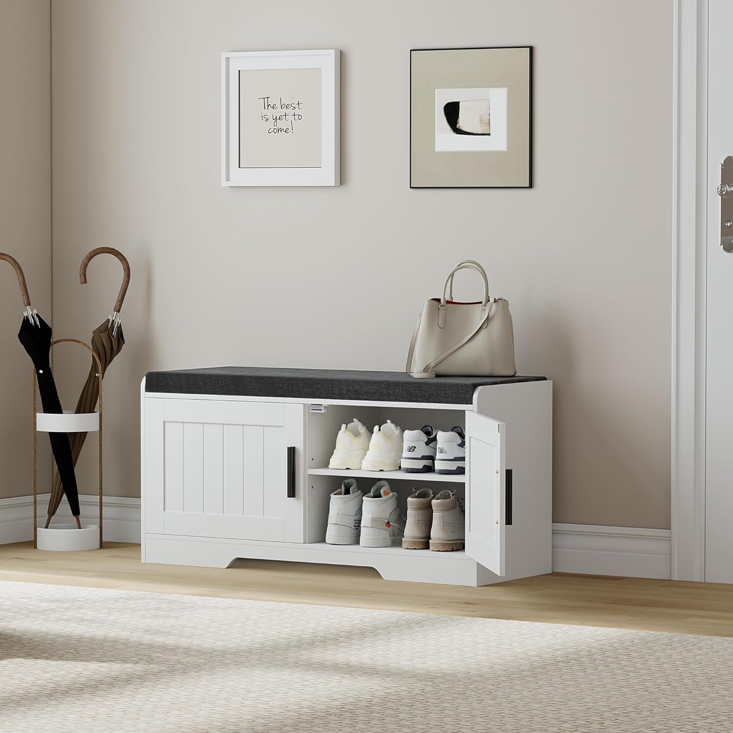 - More Comfortable Shoe Change Cabinet: With a 2-inch thickened padded sponge cushion on the bench top, you can change shoes by sitting on the bench more comfortable without bending down or squatting