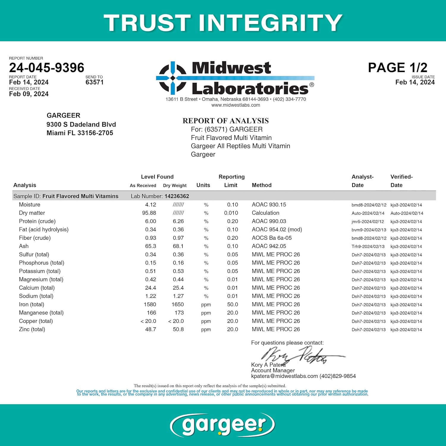 4oz Reptile Multi-Vitamin Supplement. Premium Ingredients, Rich with Organic Fruit, for Full Growth and Development Support. Boosted with Minerals and Amino Acids, Proudly Made in USA. Enjoy!