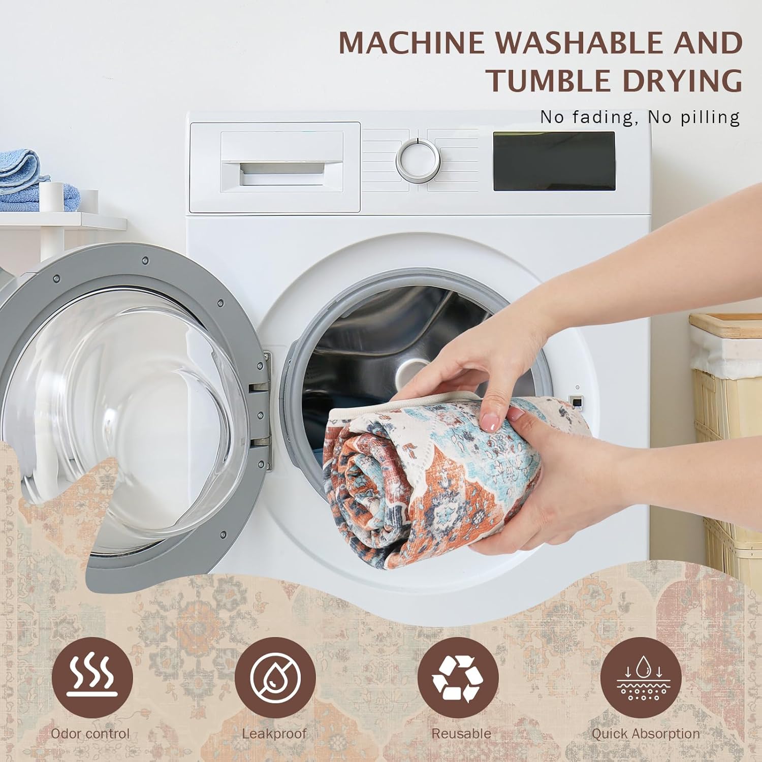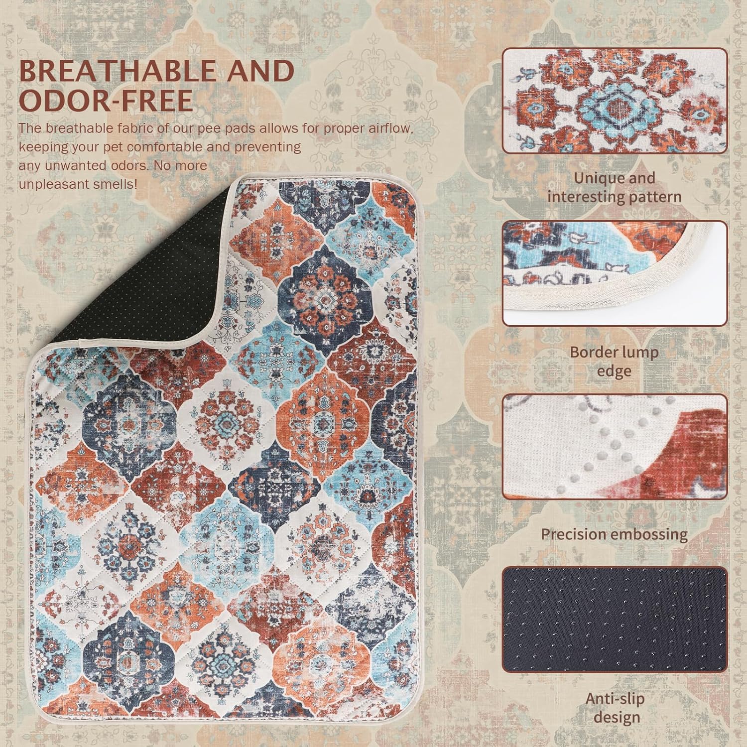 - 【Fashionable and Non-Slip】Our bohemian-print design adds a natural touch to the potty pads for dogs, giving your room a warm, casual vibe. And the non-slip bottom design makes the pet pee pads can achieve a certain fixed effect, you can put it anywhere you want. Soft and non-slip material makes it safer for dogs to use the pads.
