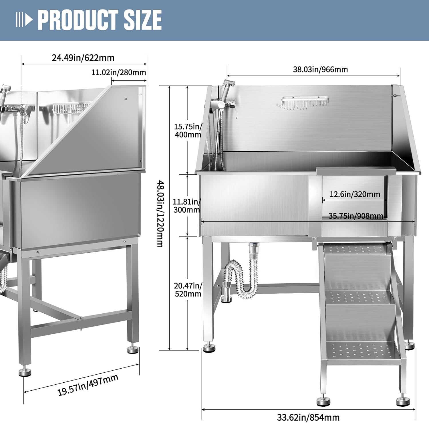 - 🐶38" Dog Washing Station: Constructed from premium 304 stainless steel, this bathing station embodies durability and corrosion resistance. Its sleek design ensures effortless cleaning, offering not only a pet bathing haven but also a functional daily sink