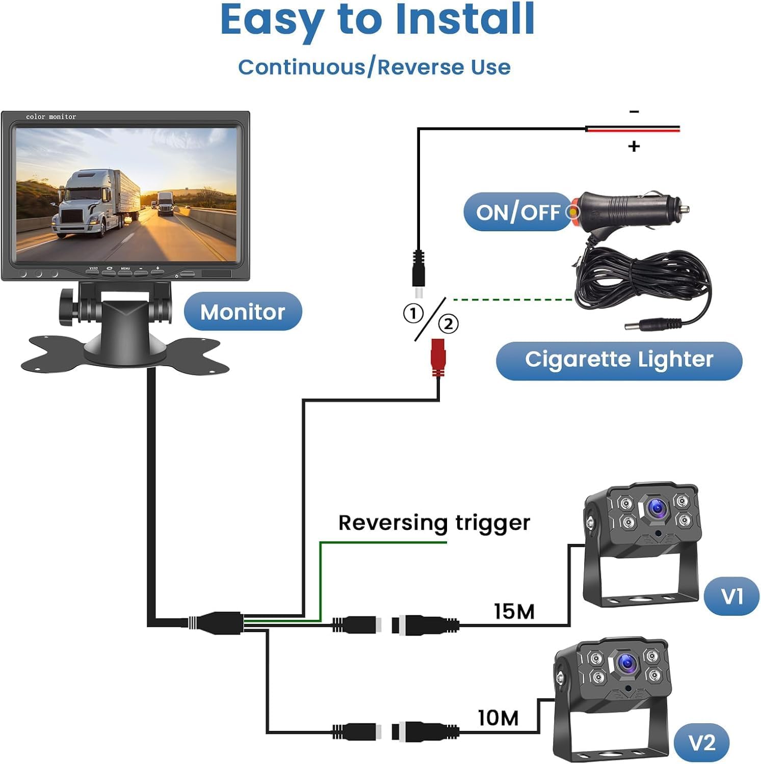 - Easy Installation: The camera and 7 inch monitor with dual cameras and connected by a power cable, the backup camera is a wired system, not a wireless system, but easy to connect and there is no interference. It can be adjusted to the right angle with a bracket up or down