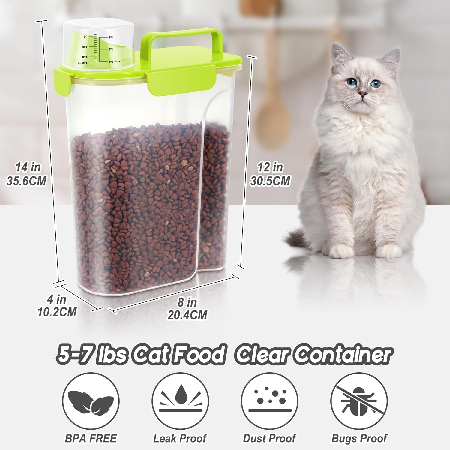 5-7Lbs Cat Dog Storage Container, Portable Pet Food Containers with Upgraded Large Spout and Cup, Small Animal Kibble Dispenser for Bird Seed, Oatmeal, Rice, Flour (1, Bright Green, 5L)