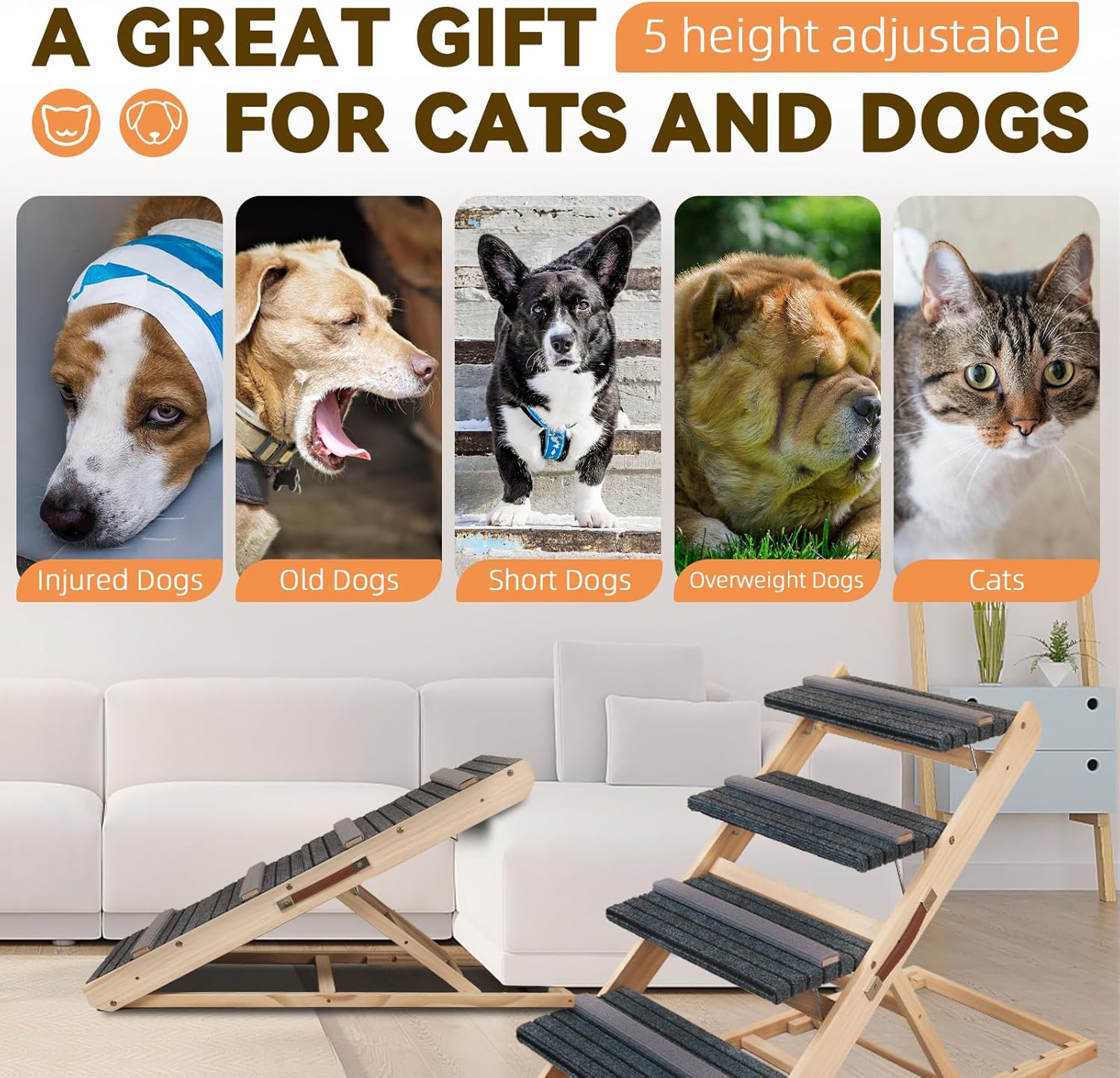 - Versatile Convertible Design: This 2-in-1 pet stair and ramp allows for easy switching between a 4-step pet stair and a ramp, offering flexible access for older, arthritic, or small pets to reach sofas, beds, and cars. It's perfect for all dogs and cats with mobility challenges.