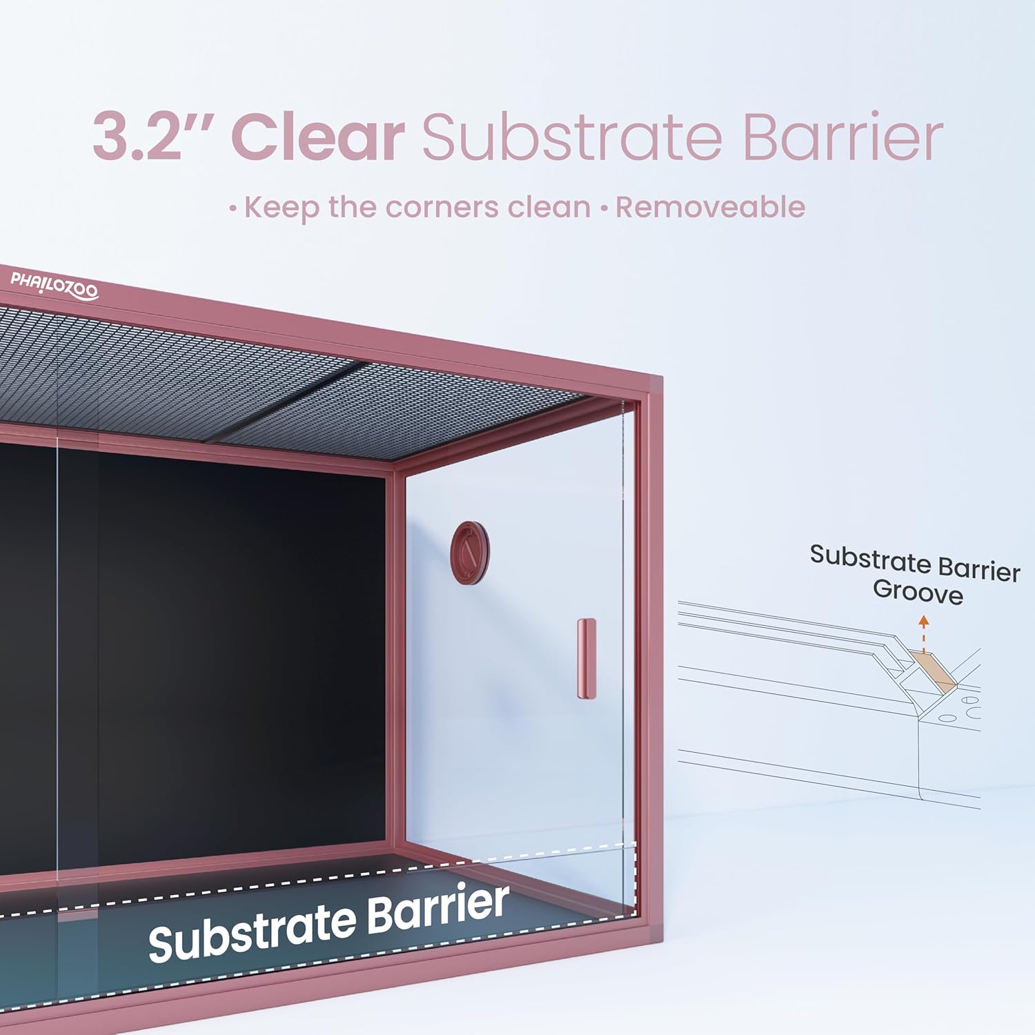 - ăEasy MaintenanceăFront opening reptile terrarium with door handles included for easy cleaning & feeding. No more suction cup problems or unsightly fingerprints all over. The substrate barrier keeps the substrate in place. Our tempered glass doors are durable enough to withstand scratching.