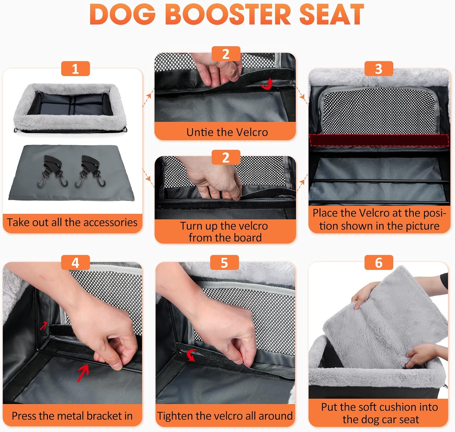 - 🐶[Cozy and Durable Material]: The dog booster car seat is crafted from durable Oxford cloth that’s water-resistant, and durable. The plush rim is filled with soft material for your furry friend to rest their paws. With an air-circulating mesh design, the seat promotes smooth breathing, ensuring a comfortable ride. Additionally, The thick cushion provides a cozy ride, making it perfect for your pet's travel needs.