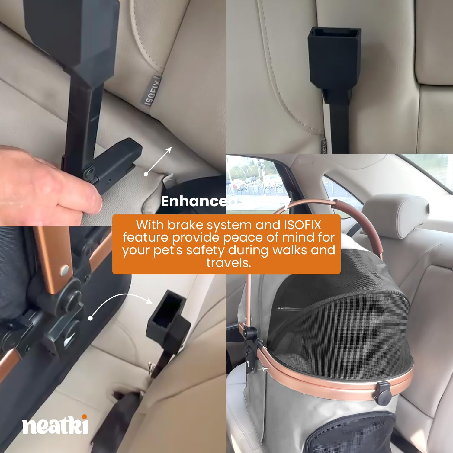 - Enhanced Safety β Equipped with a reliable brake system, this stroller keeps your pet secure and gives you peace of mind during walks and outings. Now featuring ISOFIX for easy vehicle installation, ensuring a safer, stress-free travels with your furry friend.